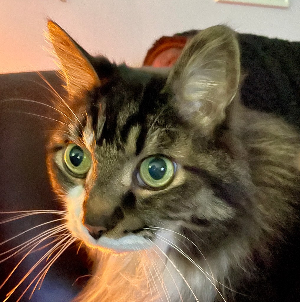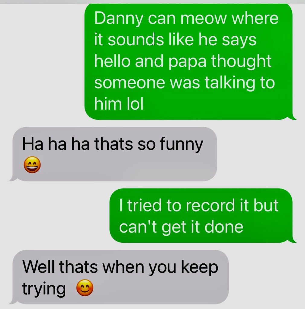 I have tried several times to get a recording of Danny saying hello, but as soon as he sees me, out comes the regular meow. I get tired of trying!