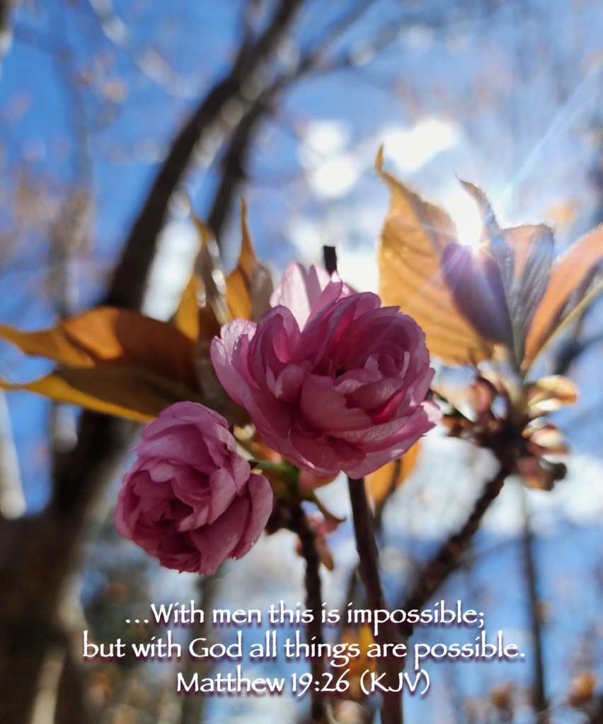 As Jesus said to his disciples in Matthew 19, verse 26: “No chance at all if you think you can pull it off yourself. Every chance in the world if you trust God to do it.” (MSG version)