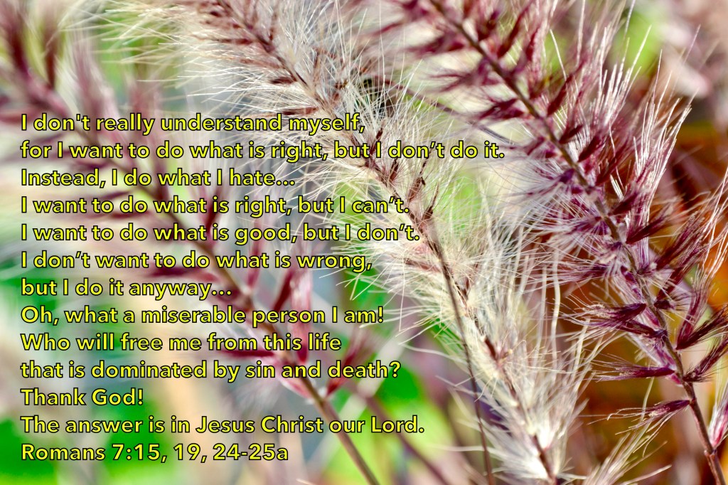 This past week I did learn to recognize in me that I do what I should not do, and don’t do what I should. Romans 7:15-24 shows us that Paul, over 2000 years ago had the same dilemma. So I know that this “thing” has been going on for ages and ages.